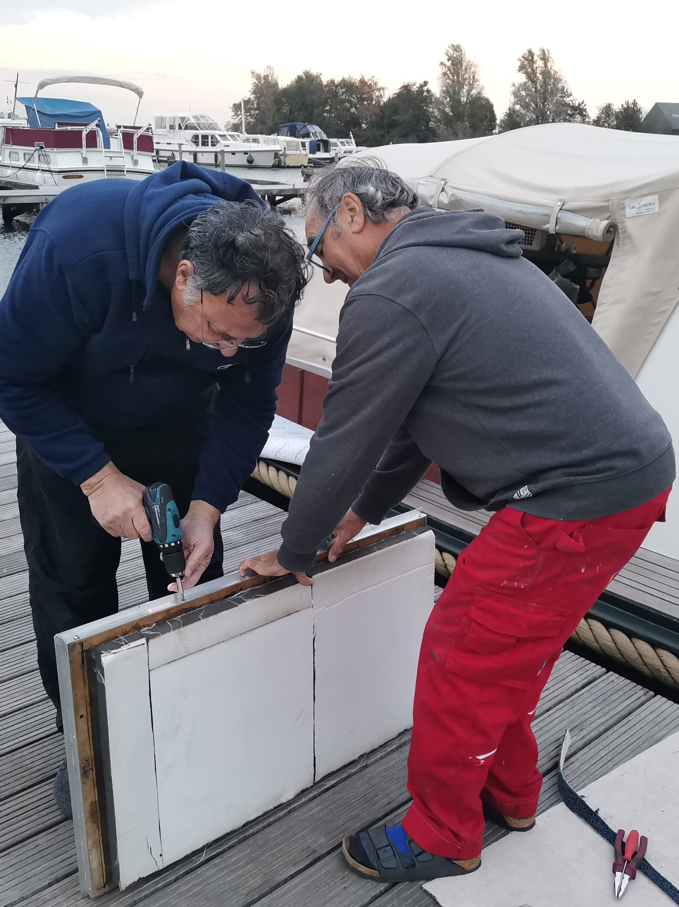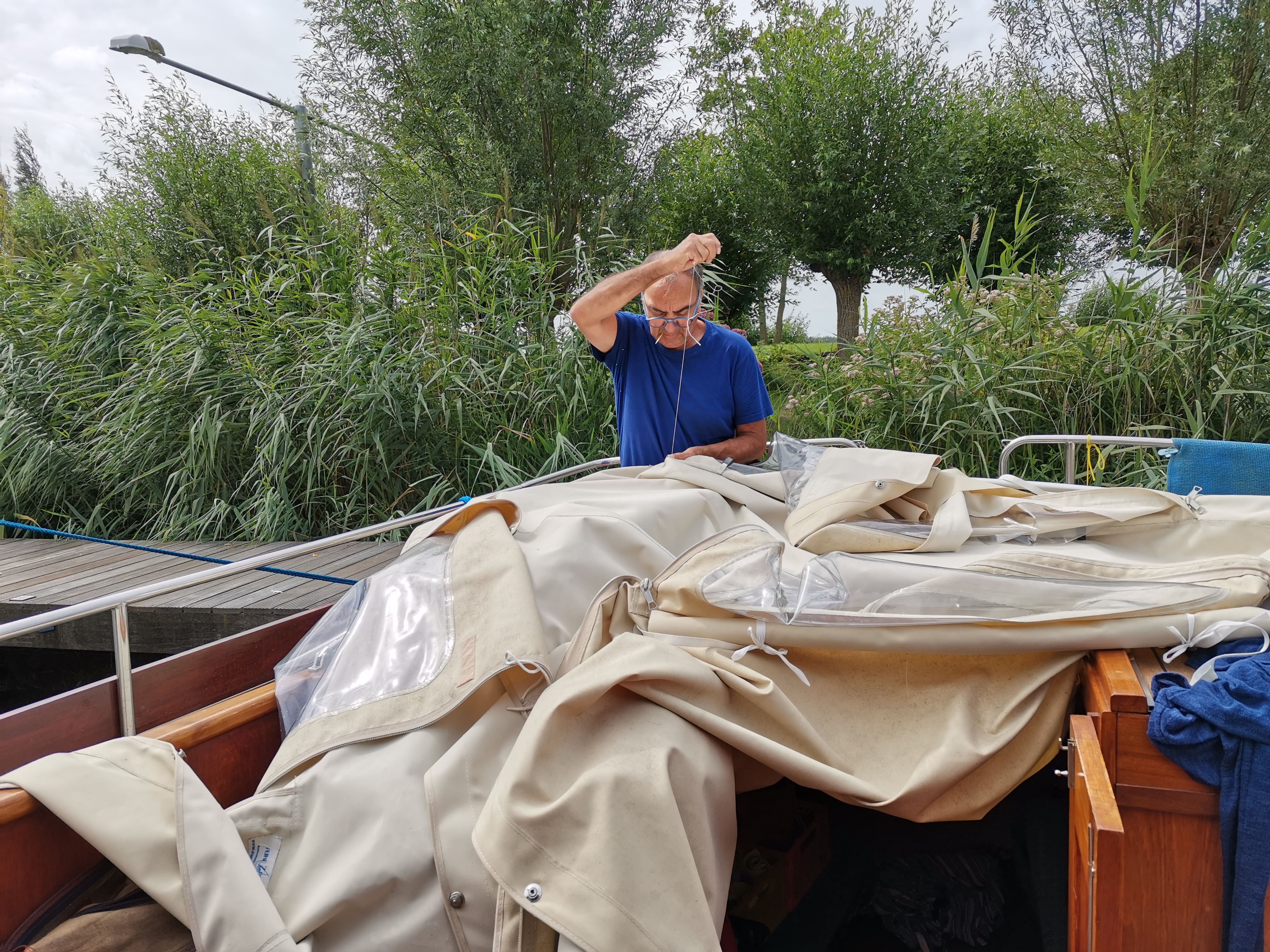 So ein Schiff gibt immer Arbeit. Unsere Zelt Verdeck sollte mal gereinigt werden. Also ab und mit Schmierseife und Bürste richtig schrubben. Oh, das kommt ja super. Sauberes Dach also wieder drauf und ordentlich spannen. Oh nein, zu viel geschrubbt. Alle Nähte lösen sich auf. Also Dach wieder runter und nähen, nähen, nähen.